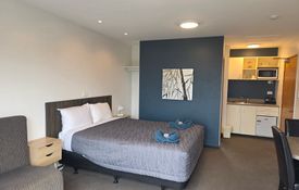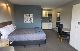 Our warm and inviting Studio Queen units offer a queen-size bed. We have x3 upstairs with a balcony and x3 downstairs units, 2 of which have ramped access. If you have a preference, please confirm on booking which one is required, and depending of availability we will do our best to accommodate. These units have an ensuite with a shower, cooking facilities (including a mini fridge, microwave, electric frying pan, electric hobs available on request, jug, toaster). Other features include 32" TV, SKY TV 50+ channels, wireless internet, iron and ironing board on request and hairdryer. Milk, tea selection, instant and Tuatara plunger coffee and sugar etc. are supplied.